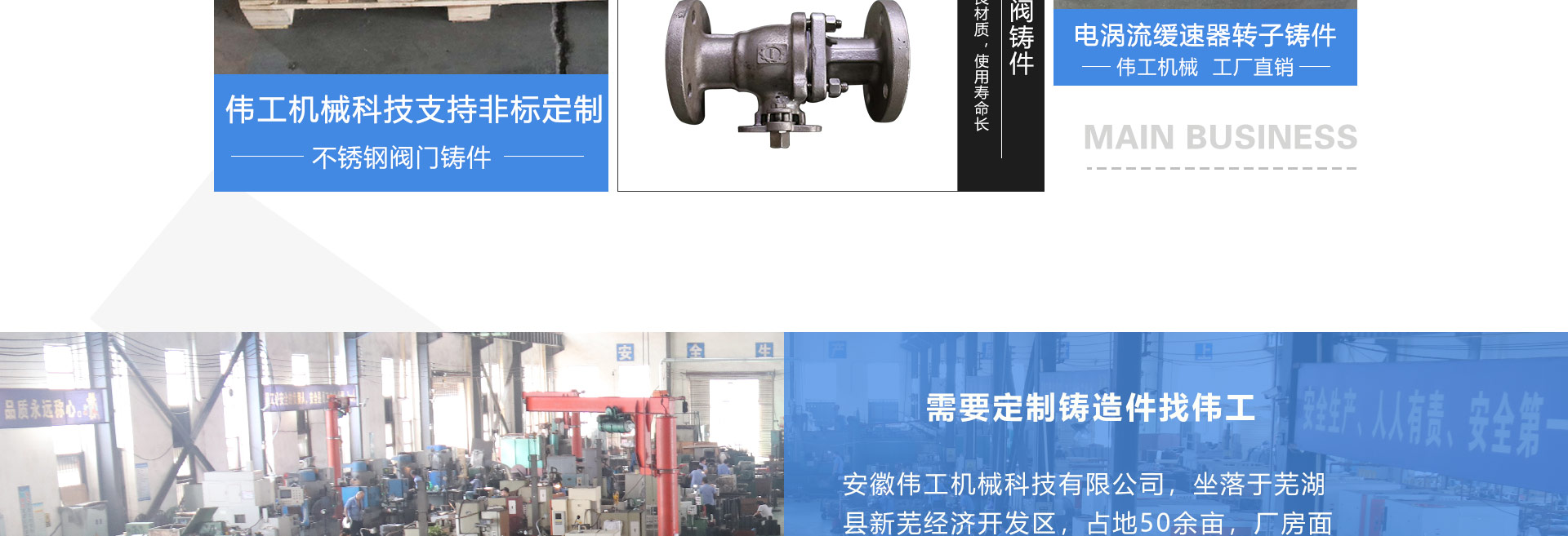 安徽偉工機(jī)械科技有限公司,坐落于安徽蕪湖新蕪經(jīng)濟(jì)開發(fā)區(qū),是一家専業(yè)從事鑄造產(chǎn)品設(shè)計、研發(fā)、生產(chǎn)、銷售于一體的企業(yè),公司為客戶的產(chǎn)品提供多樣的技術(shù)支持與設(shè)計,公司主要鑄造技術(shù)有潮模砂鑄造、硅溶膠精鑄工藝。主要產(chǎn)品有:不銹鋼閥門配件、泵閥配件、汽車配件、工業(yè)管道配件、工程機(jī)械配件、汽車配件等。材質(zhì)為:低合金鋼、304、316、316L、鉻鉬鋼、哈氏合金、碳鋼、雙相鋼等。公司已先后通過ISO9001和TS16949等多種體系審核,以完備的管理手段和齊全的檢測設(shè)備滿足客戶需求,進(jìn)的設(shè)備,専業(yè)的技術(shù),嚴(yán)謹(jǐn)?shù)墓芾恚€(wěn)定的質(zhì)量。服務(wù)客戶,鑄造未來,偉工誠摯的歡迎新老客戶共同商洽合作
